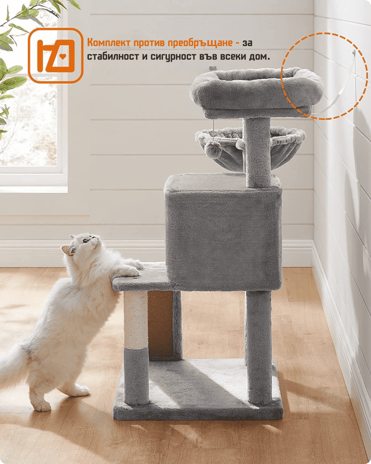 Независимо дали имате малко котенце, възрастна котка или по-пухкаво мъркащо приятелче, този модерен и устойчив котешки център е създаден да осигури комфорт, игра и безопасност за любимеца ви – всичко на едно място!
